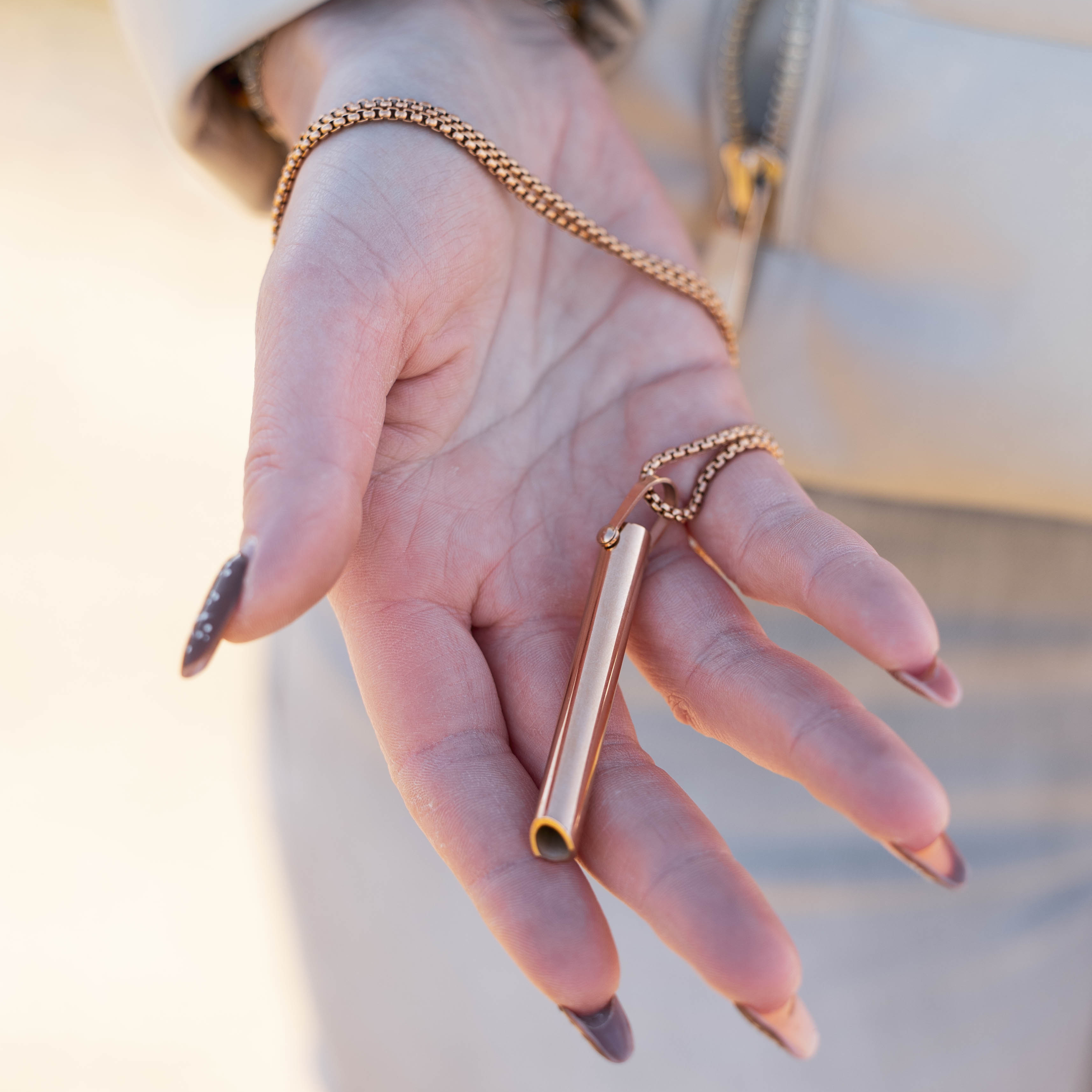 Jestem w pełni zadowolona z wyboru. Wzięłam wersję złotą; długość łańcuszka jest idealna. Jest bardzo wygodny i wygląda elegancko — nie muszę go ukrywać. W pracowite dni uspokaja mój umysł, a chęć zapalenia jest mniejsza.